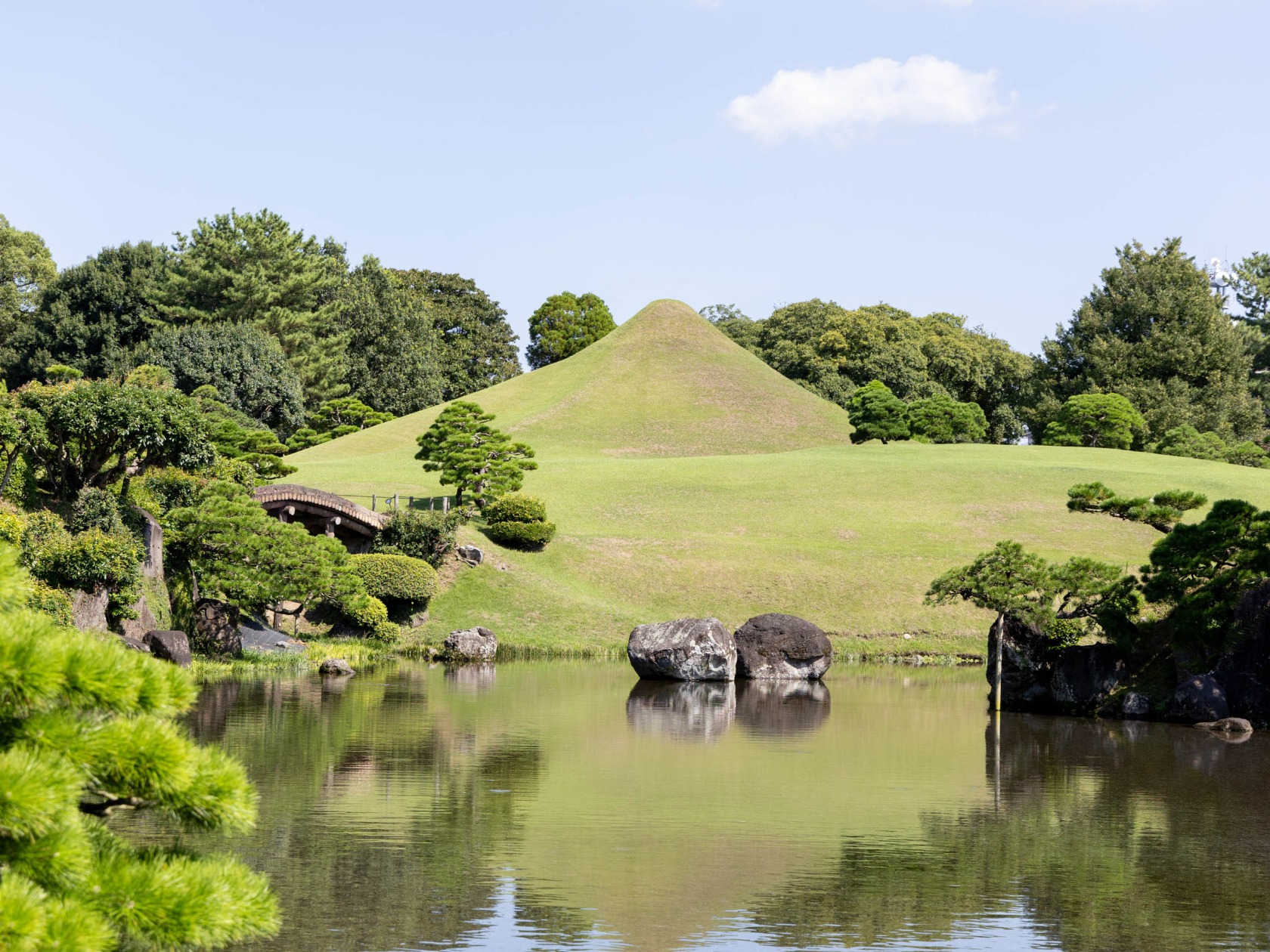 • 富士山を模した築山:緑の芝生が美しい庭園のシンボル。