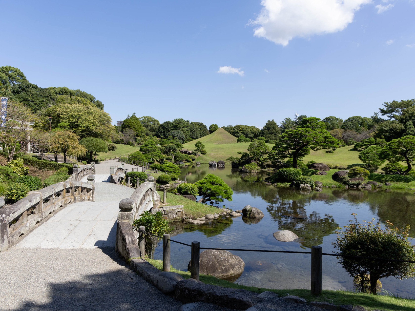 熊本藩主細川家ゆかりの池泉式回遊庭園。阿蘇の伏流水が湧き出る池を中心に、東海道五十三次を模したといわれる美しい景観が広がります。富士山に見立てた築山や、京都から移築された古今伝授の間など見所も多く、四季折々の自然と歴史が織りなす優美な世界で、ゆったりとした時間をお過ごしください。