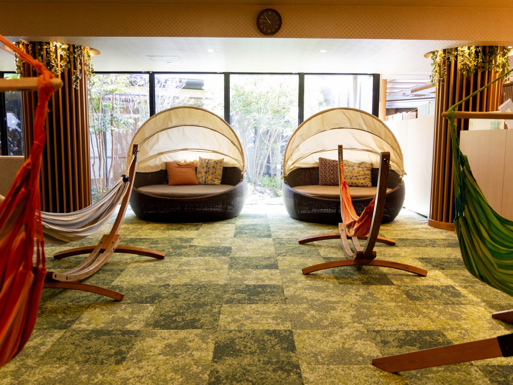• くつろぎエリアには、暖炉・ハンモック・個室の休憩室など多種多様な休憩スペースでサウナ上がりに過ごせます!