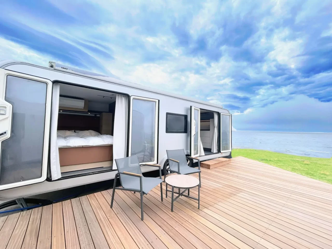 ベッドやキッチン、エアコンも完備の様々なトレーラーハウスが全18室と、