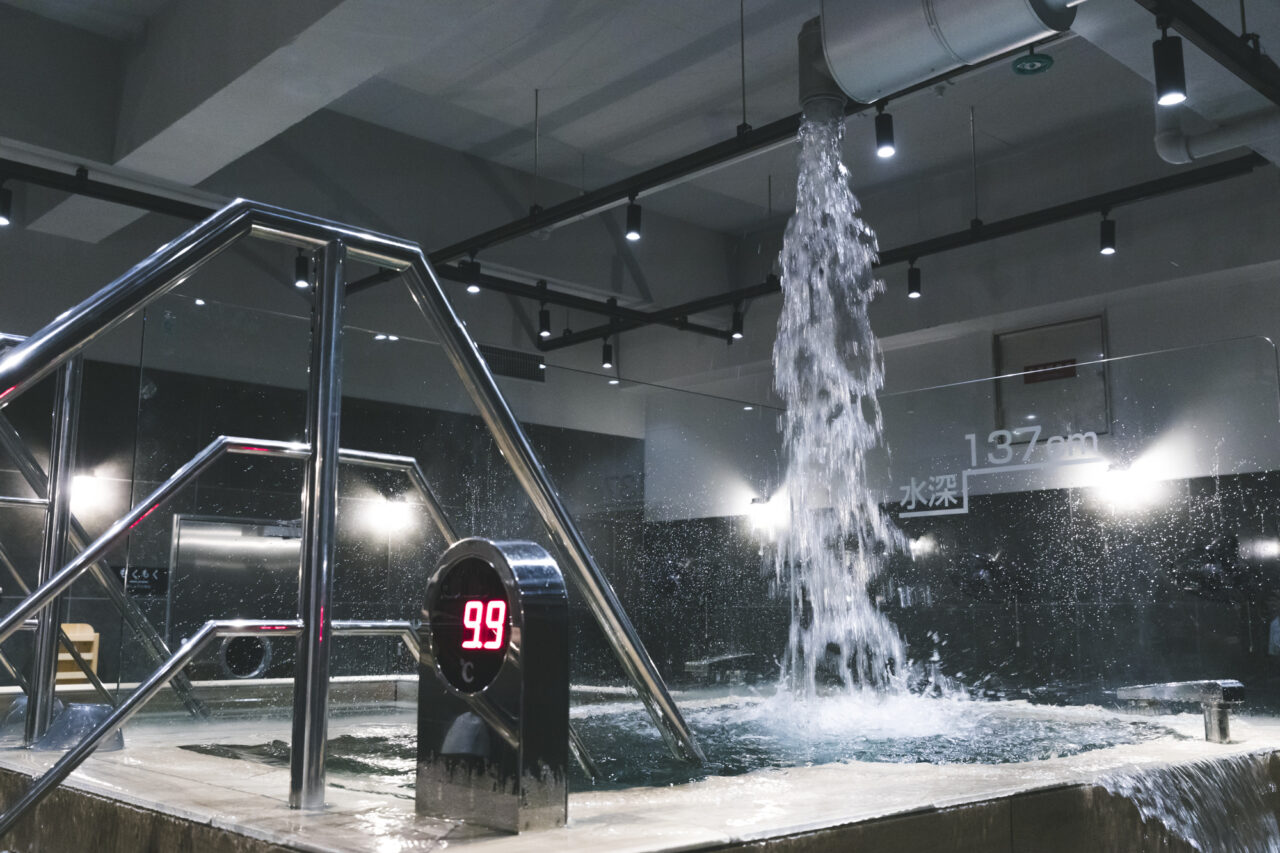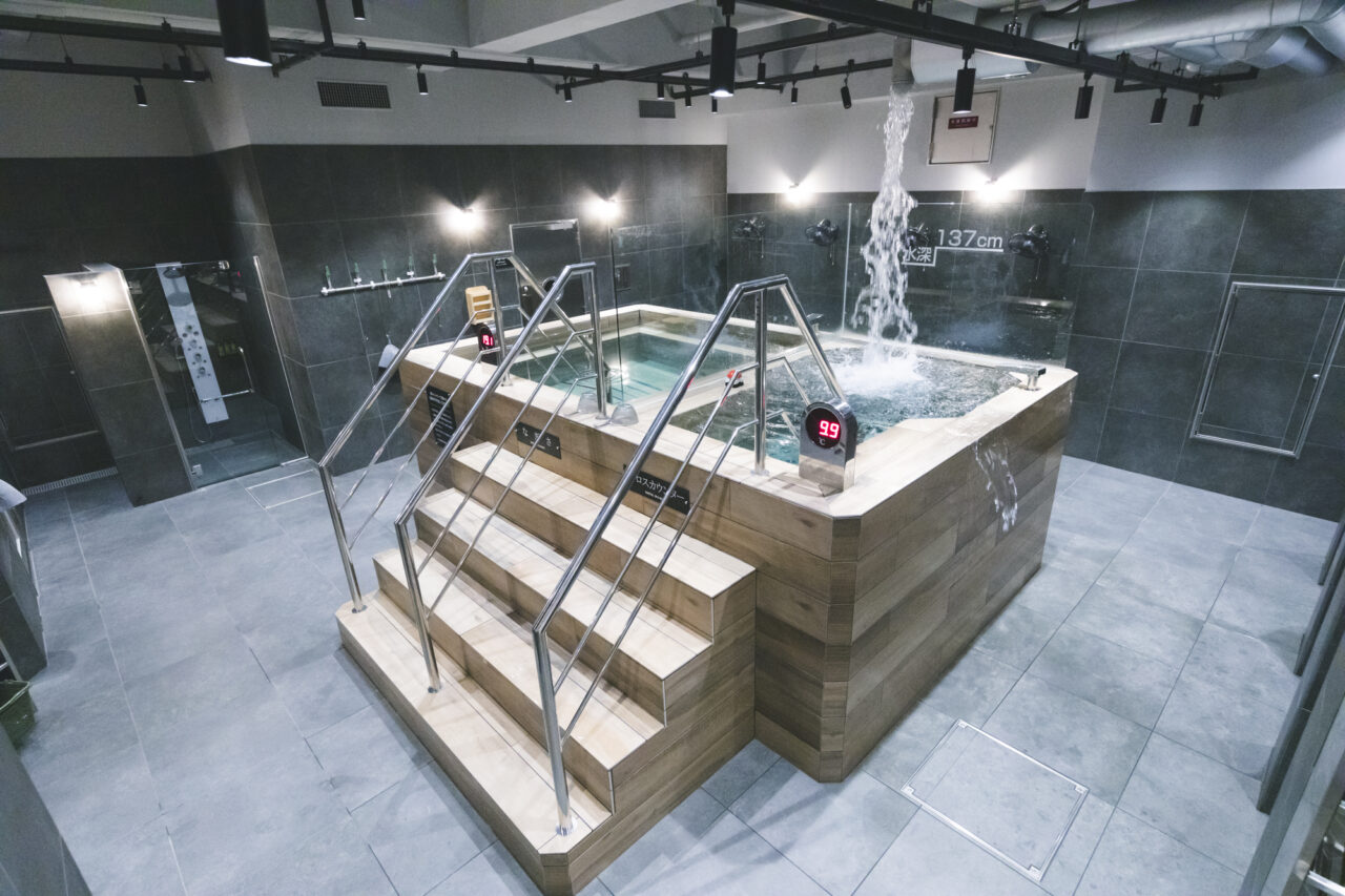 水風呂「クロスカウンター」は、四方からジェットが噴出し、頭上から毎分250Lの冷水が降り注ぐ、未体験の爽快感を味わえるスポット。