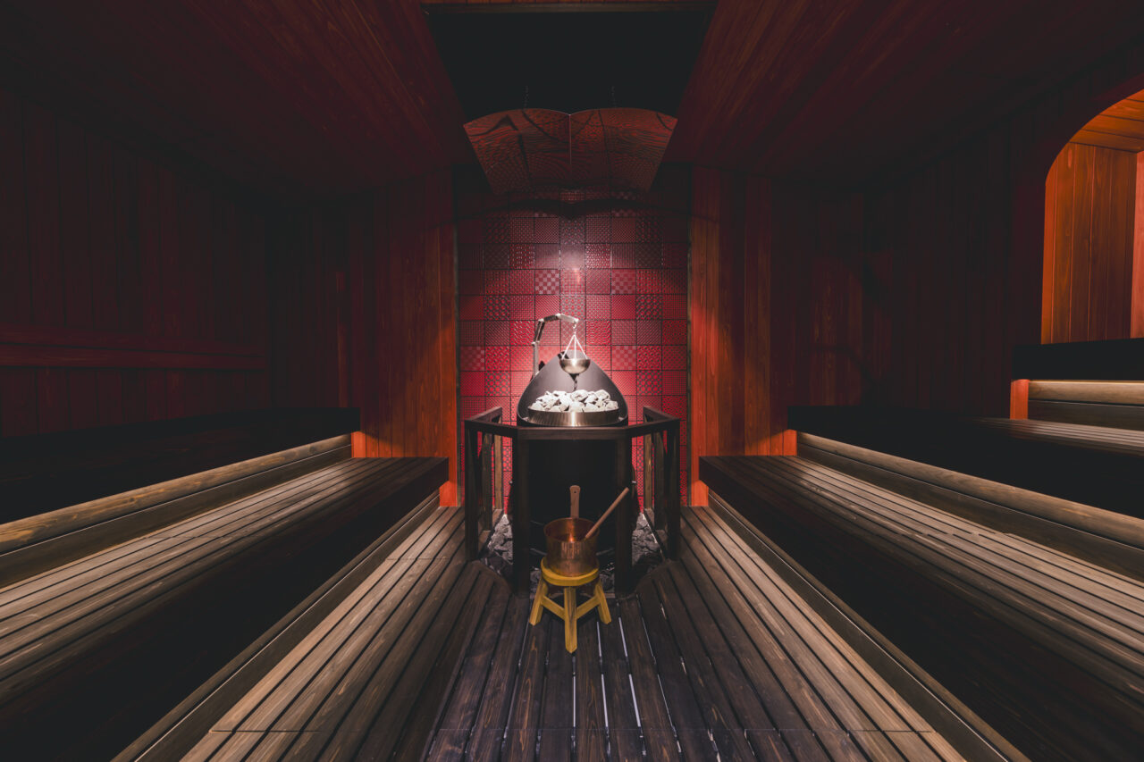 室内は静寂を楽しむ“黙浴”専用。落ち着いた照度に設定されているため、セルフロウリュによる音や蒸気、湿度の変化に集中できます。