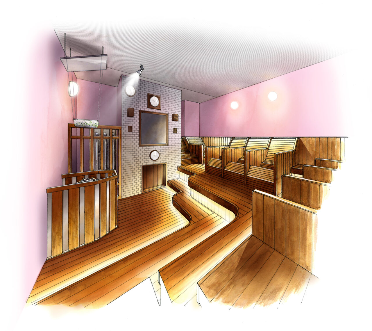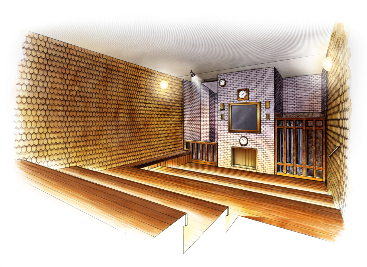アウフグースイベントにも対応したスタジアム型サウナとして、迫力ある蒸気と熱波を体感できる“紳士のためのサウナ空間”となります。
