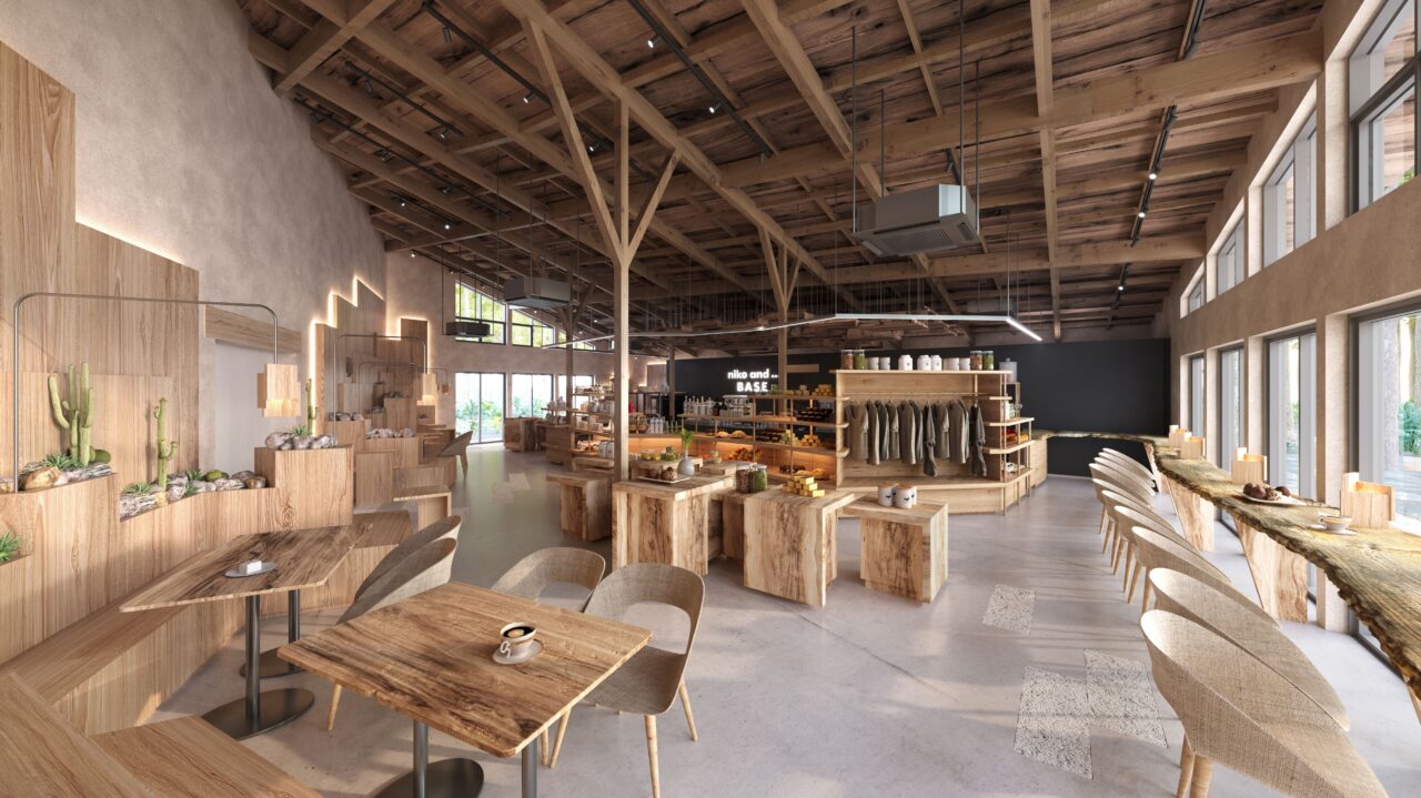「niko and … COFFEE」のカフェラウンジは、木のぬくもりを存分に味わえる空間デザインに。
