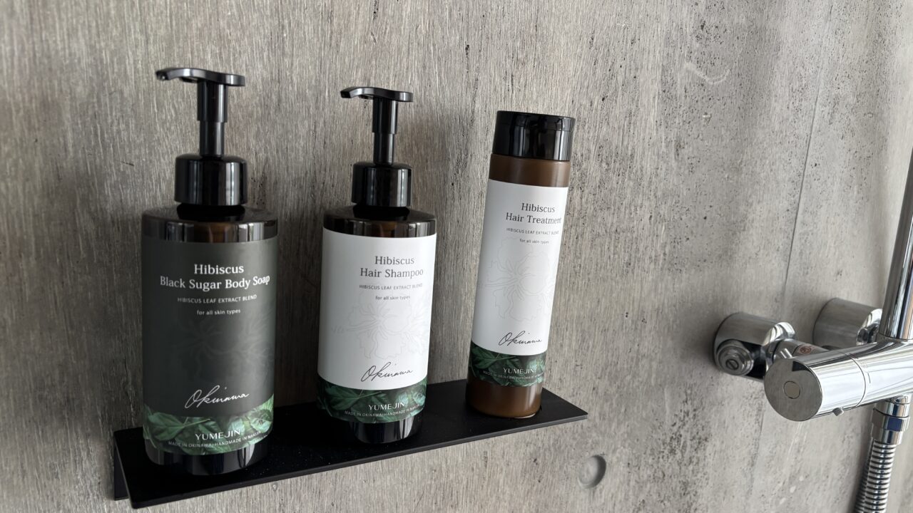 沖縄発のボタニカルケア「YUMEJIN」の無農薬沖縄県産ハイビスカスシャンプー、沖縄県産マットレス、寝室の壁に沖縄の土を使った漆喰「レキオライム」を採用するなど、全身で沖縄を感じられる要素がつまっています。