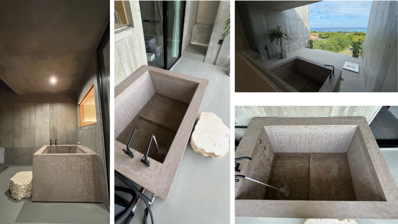 水風呂へ上がる踏み台(ステップ)は、重量200kgもあろうかという「琉球石灰岩」を採用し、オーナー自ら採石場で石を選別したこだわりのポイントです。