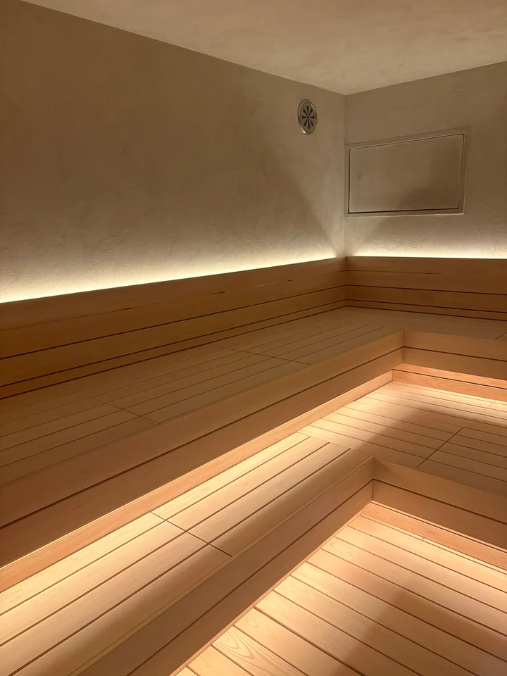 サウナ室内の壁には、化学素材を一切使わない天然の塗り壁材「水硬性石灰」を採用。