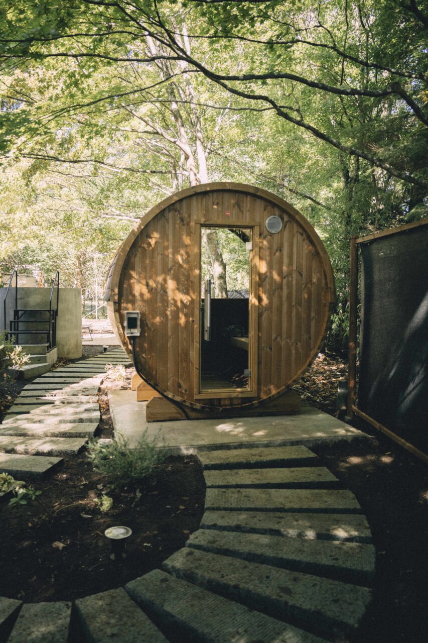自然に囲まれたバレルサウナ、深さ150cmの潜れる天然水風呂、豊富なととのいスペースを完備した、貸切サウナ付き宿泊施設です。