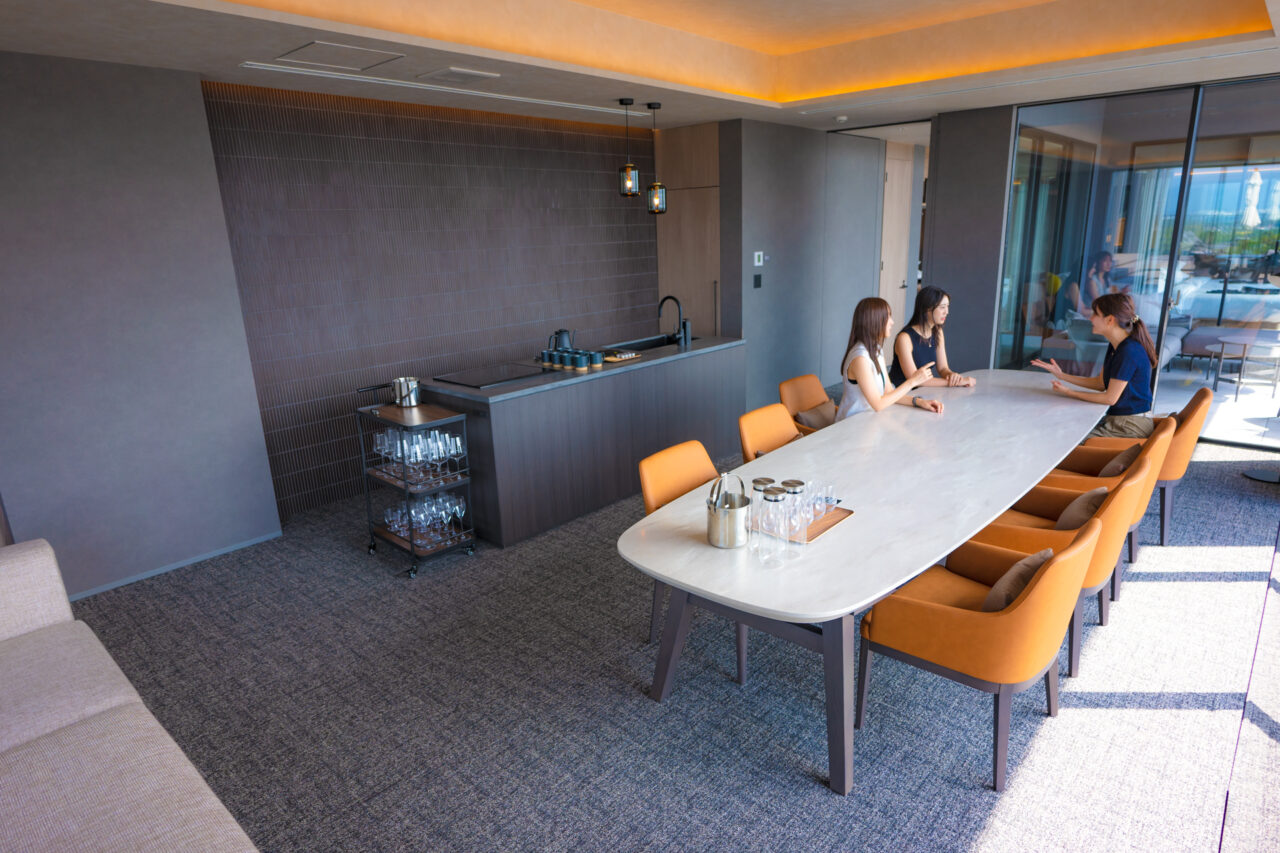 サミットみたいな長いテーブルで食事や会議を楽しんだり、大きなソファで団らんしたりと、ほとんど家のような過ごし方がなんでもできる部屋でした。