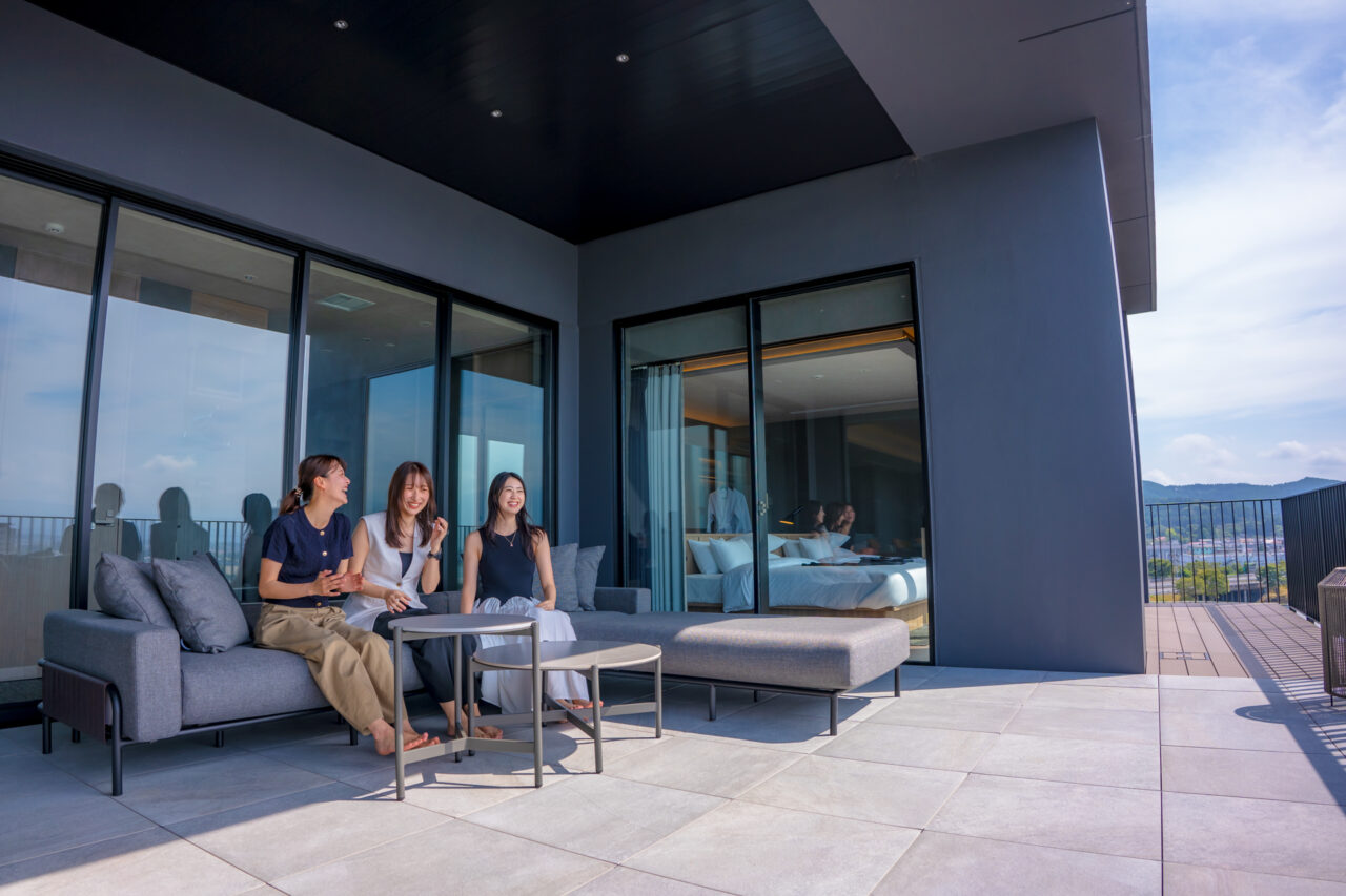 全客室にバルコニーを完備し、全49室・12タイプの客室には、最大8名まで利用できる広々としたスイート、サウナ付客室、愛犬と泊まれるドッグフレンドリールームなどがあり、一緒に訪れるグループの構成に合わせたお部屋を選べるのが魅力的です。