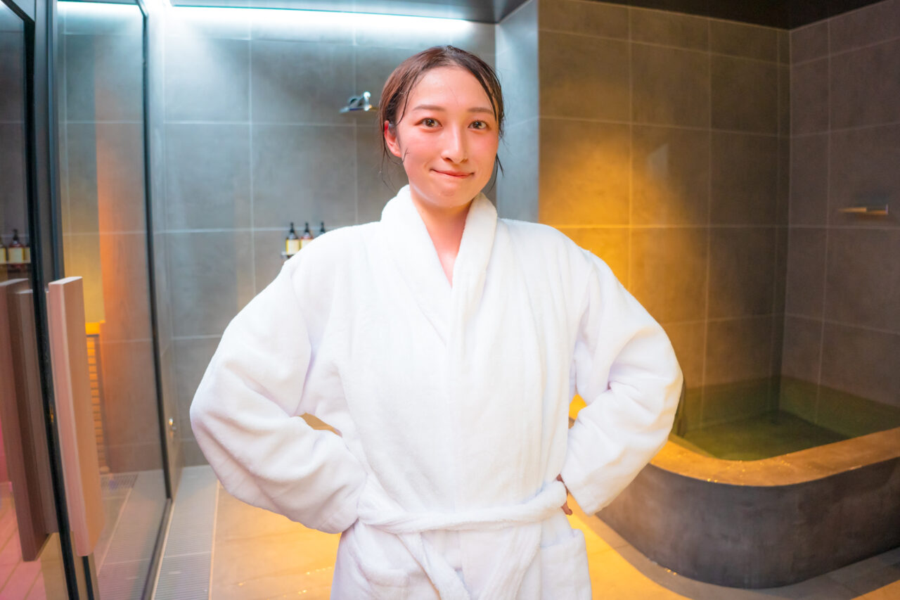 水風呂は深くて広く、大人3人でもゆったり入れるサイズ感ですし、外気浴も外の気温をしっかり感じられ、心地よくととのえます。バスローブはふわふわの生地で着心地抜群。テレビや机も完備されているので、ととのった後に熱いトークを楽しむのにもぴったりです。
