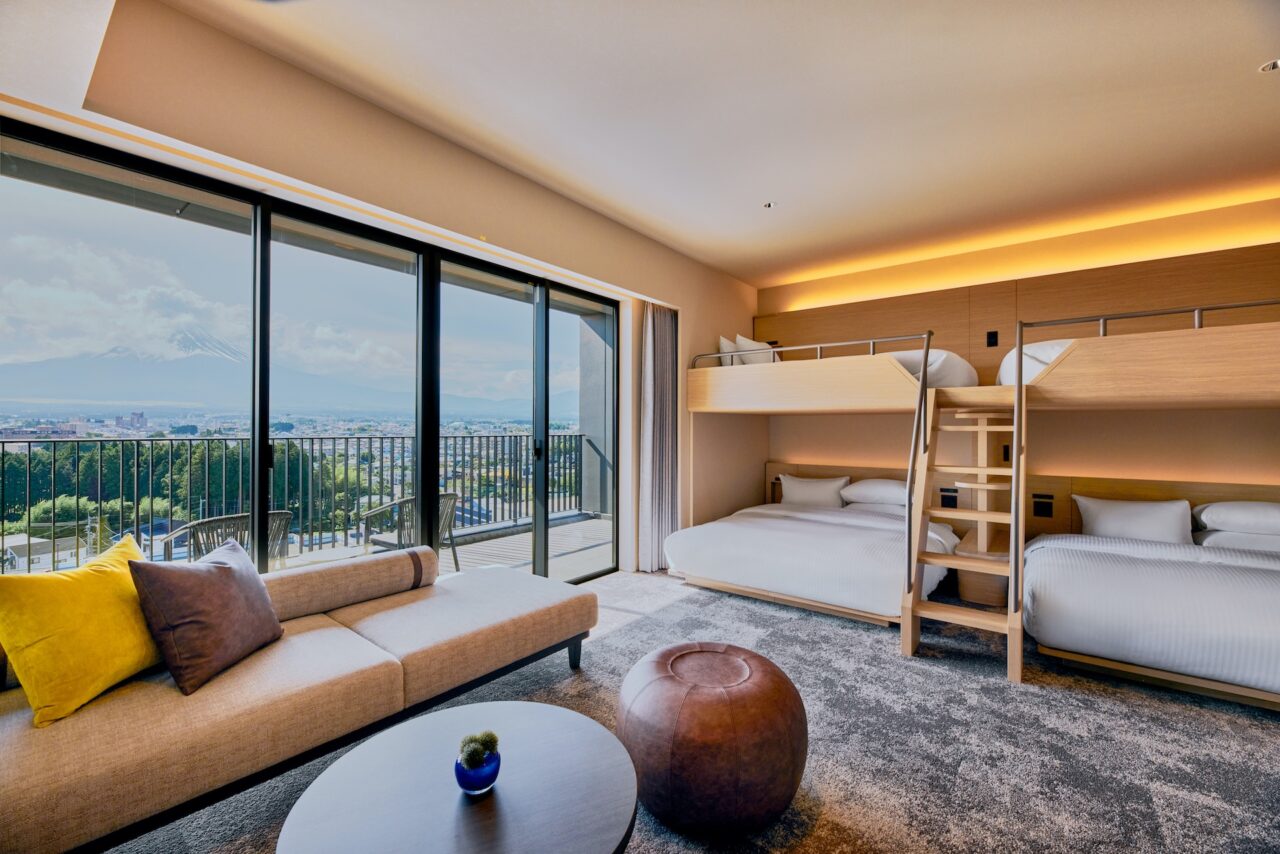 4〜6人のグループ利用が可能な「サウナ バンクスイート(富士山ビュー)」は、かわいい二段ベッドが特徴の広々とした客室です。
