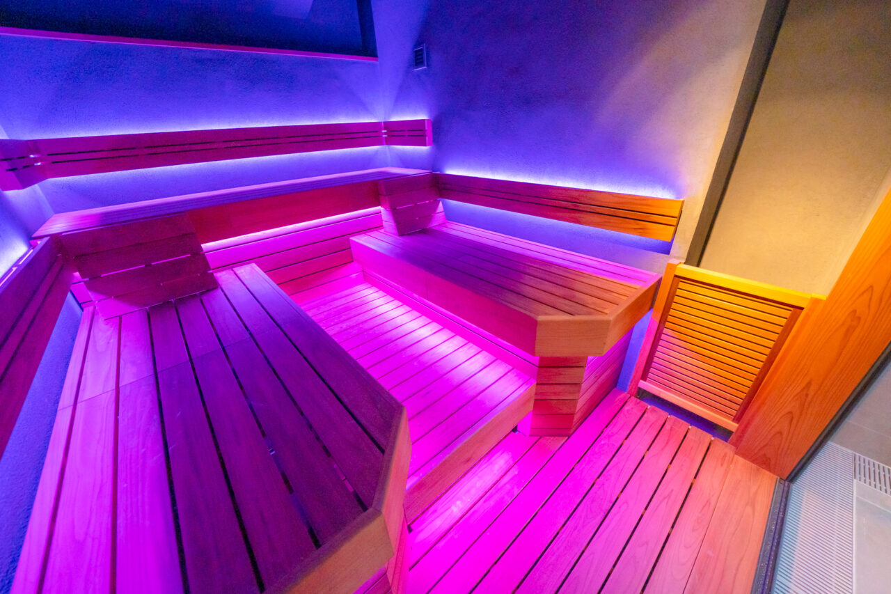 大人3人が寝転べるほどの広々としたサウナ室が嬉しい!ライトをセットごとに変えられるので、雰囲気を楽しみながら飽きずに過ごせます。