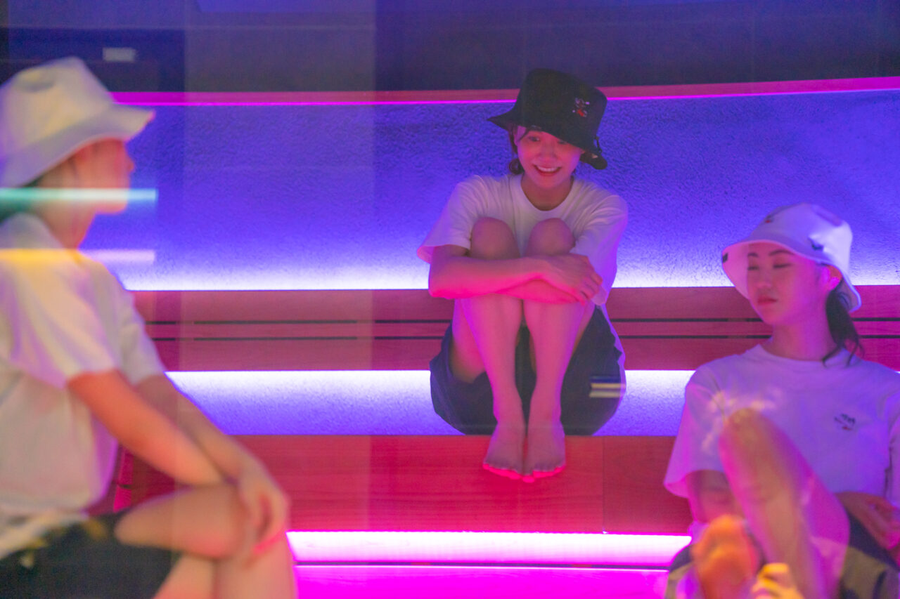 調光可能な間接照明がムーディーなサウナ室はかなり広く、友達と来たら100%盛り上がる見た目をしていました! コの字に座ることができるので、グループでお喋りしながら長く入るのに最適な構造です。