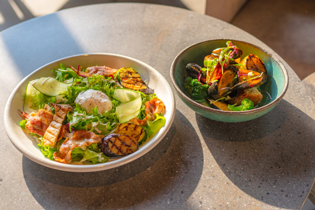 こちらは前菜の「濃厚ハム工房ベーコンと御殿卵のサラダ仕立て」と「ムール貝のバジルスチーム」。
