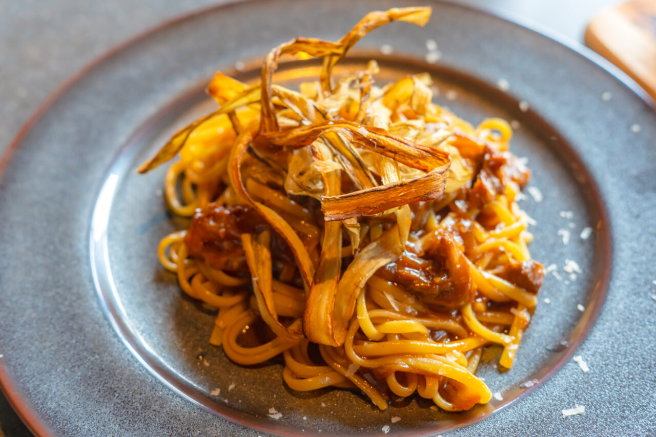 一般的にボロネーゼといえば、ひき肉とトマトソースを思い浮かべますが、こちらはじっくり煮込んだ柔らかな牛すじ肉を使用。赤ワインで深みを出したソースが、平打ちのリングイネにほどよく絡み、そこに搾りたてのチーズが合わさって、格別の味わいでした。