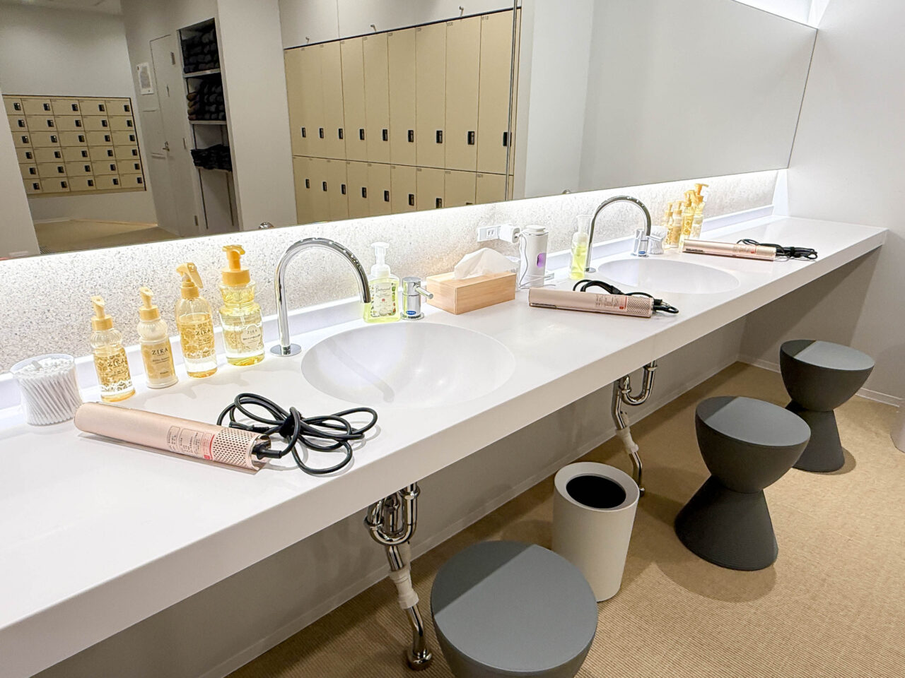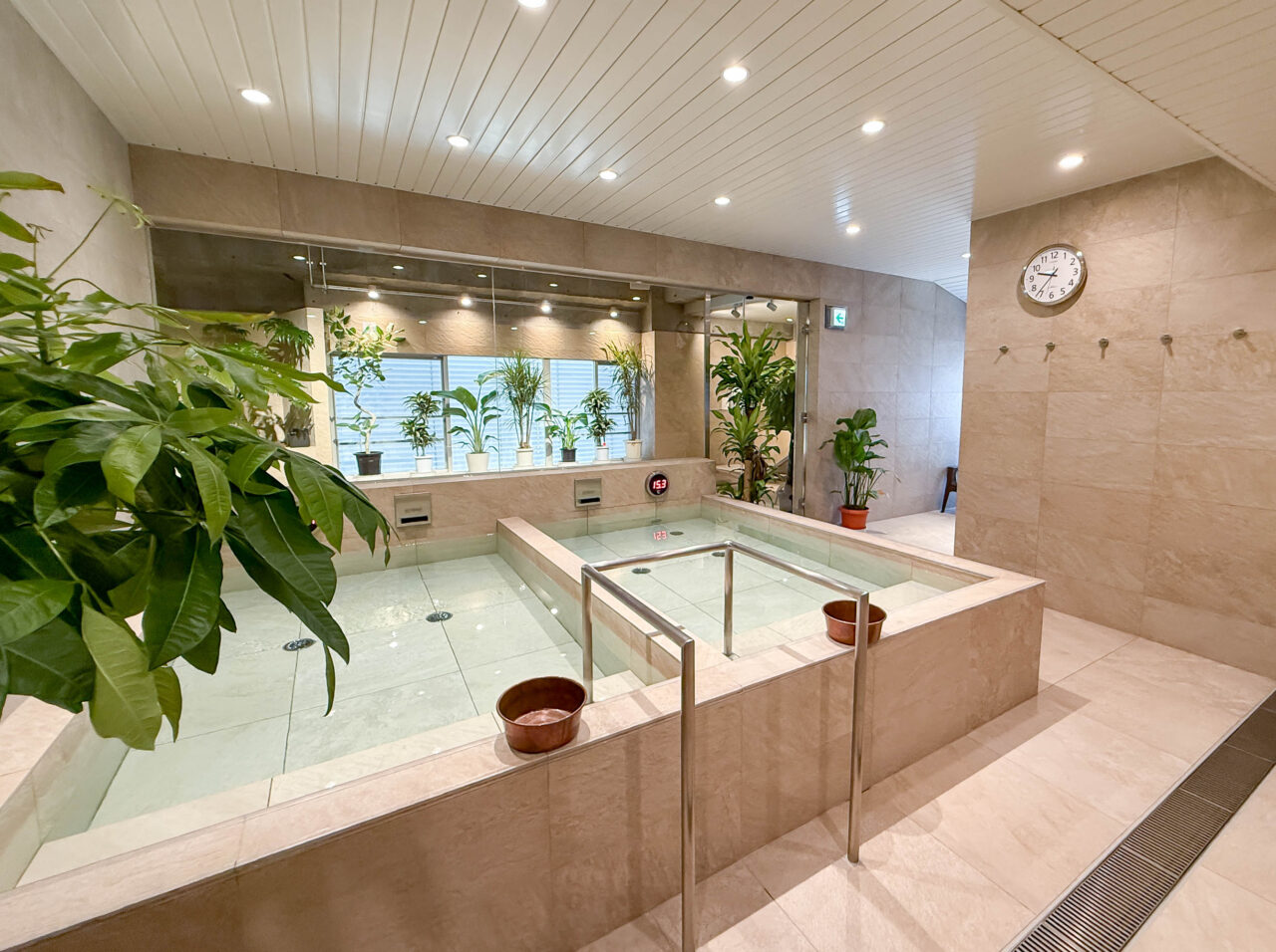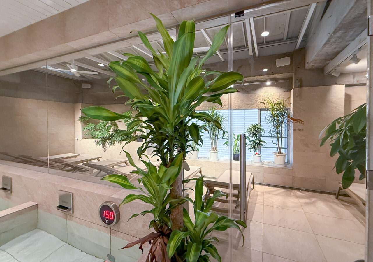 湯船もシャワーブースも清潔感たっぷり、そしてスタイリッシュ!外と中を行き来しながら、お風呂にサウナに、外気浴にと、時間の許す限りたっぷり楽しめるフロアでした。