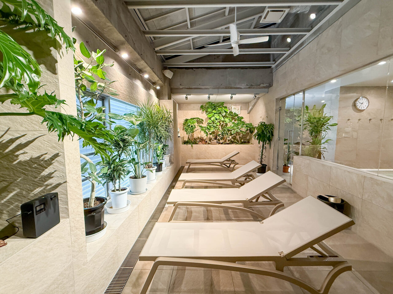 水風呂→休憩スペースも動線完璧!心地いいそよ風を浴びれば、一瞬でリフレッシュ……。