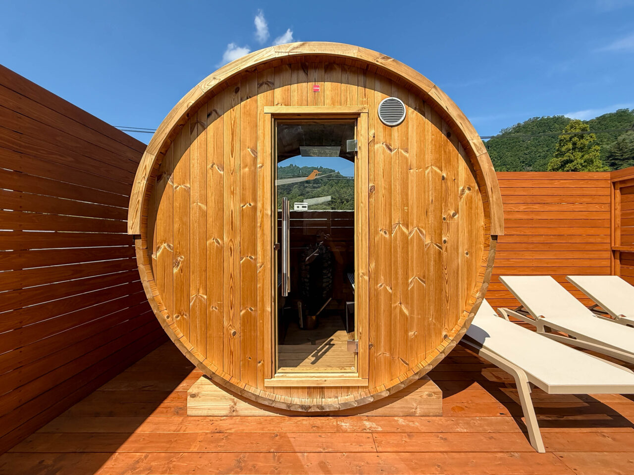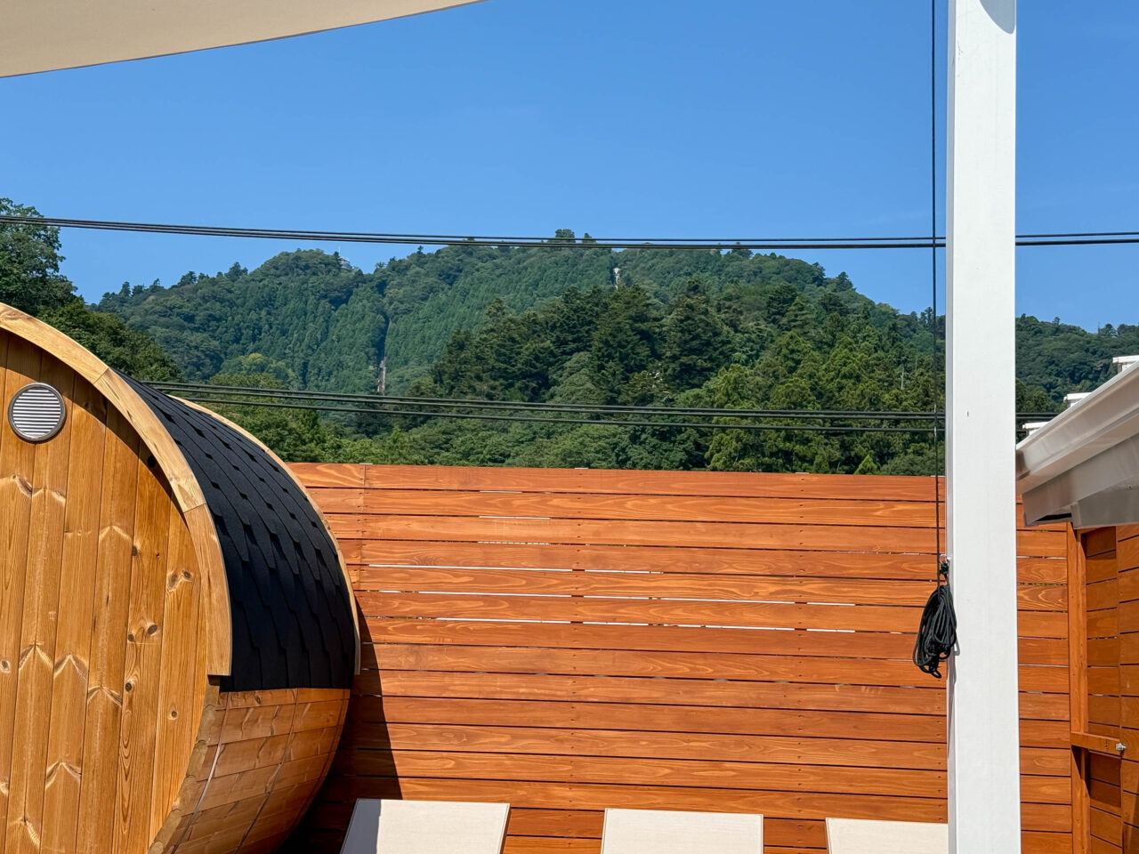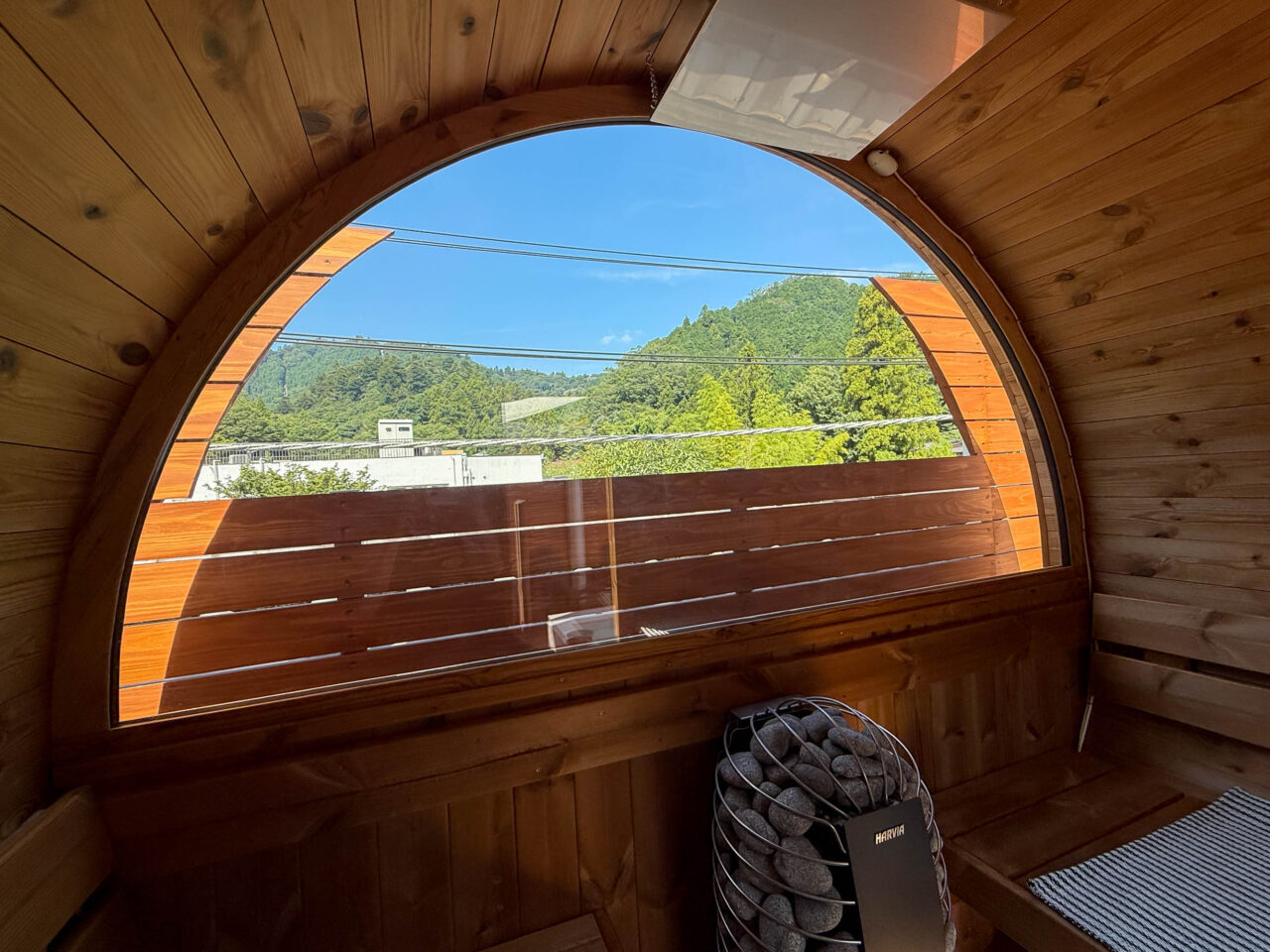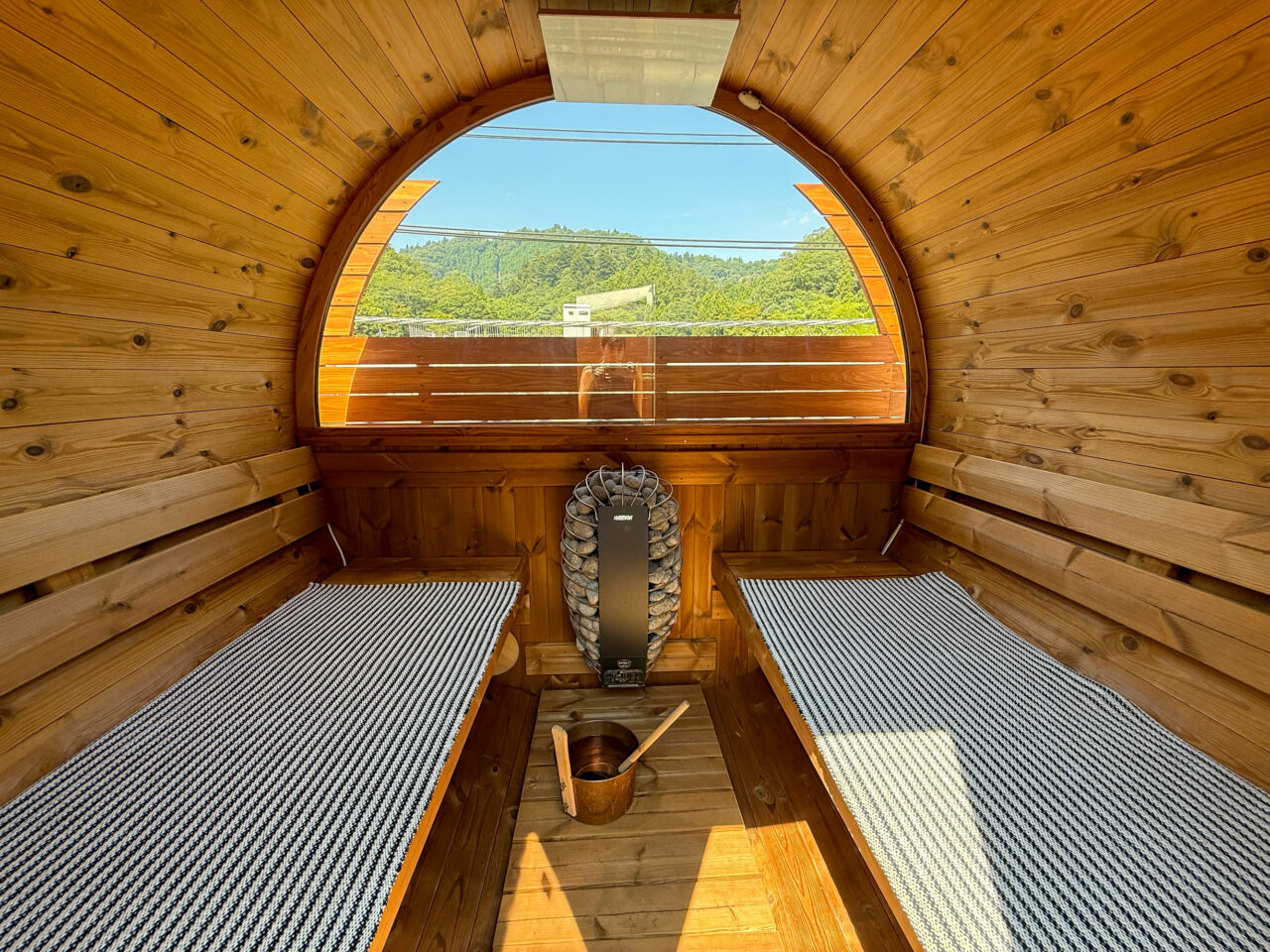 バレルサウナ「kawasemi」では、ガラス越しに高尾山の山並みを見渡せる開放的なサウナです。