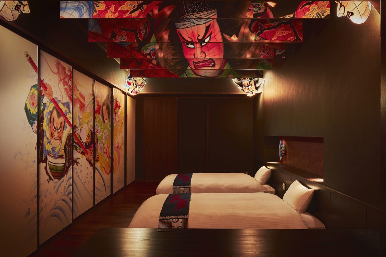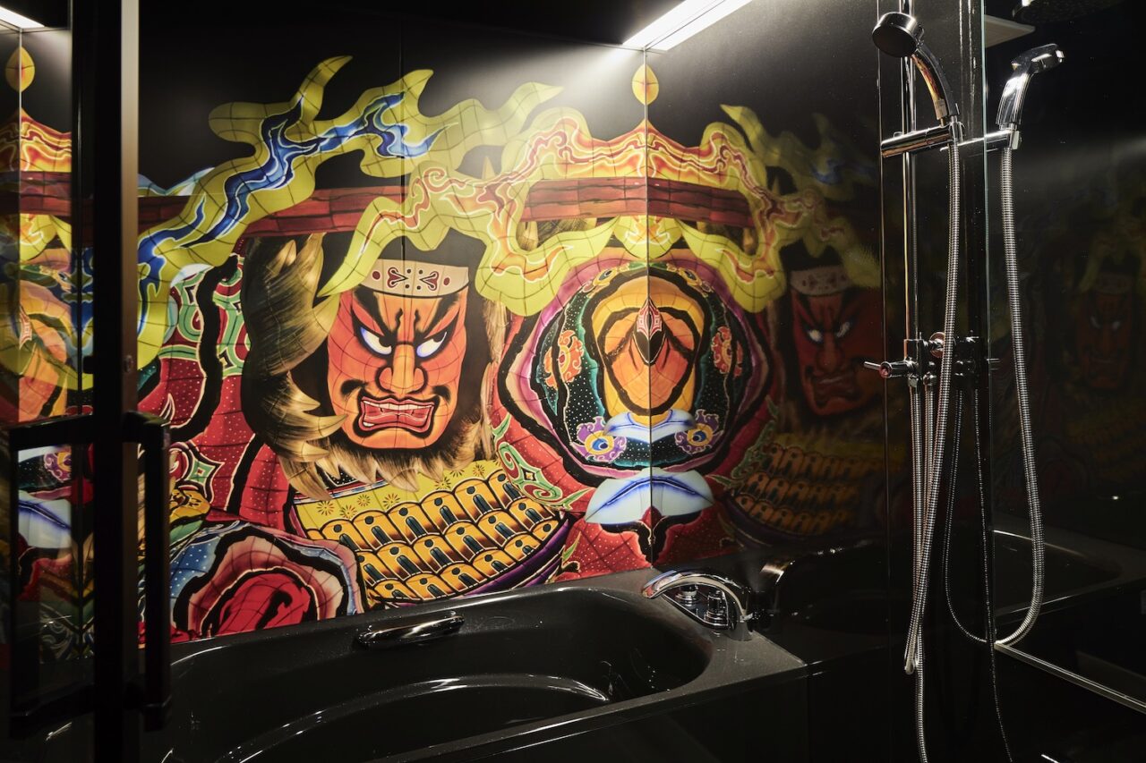 寝室にも美しいねぶたが。文化体験としてとても楽しめる部屋です。
