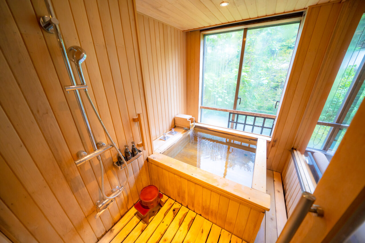 特に青森ヒバで作られた浴槽浴室が香り高い、半露天風呂付き客室は、時間を気にせず温泉につかることができるので最高。