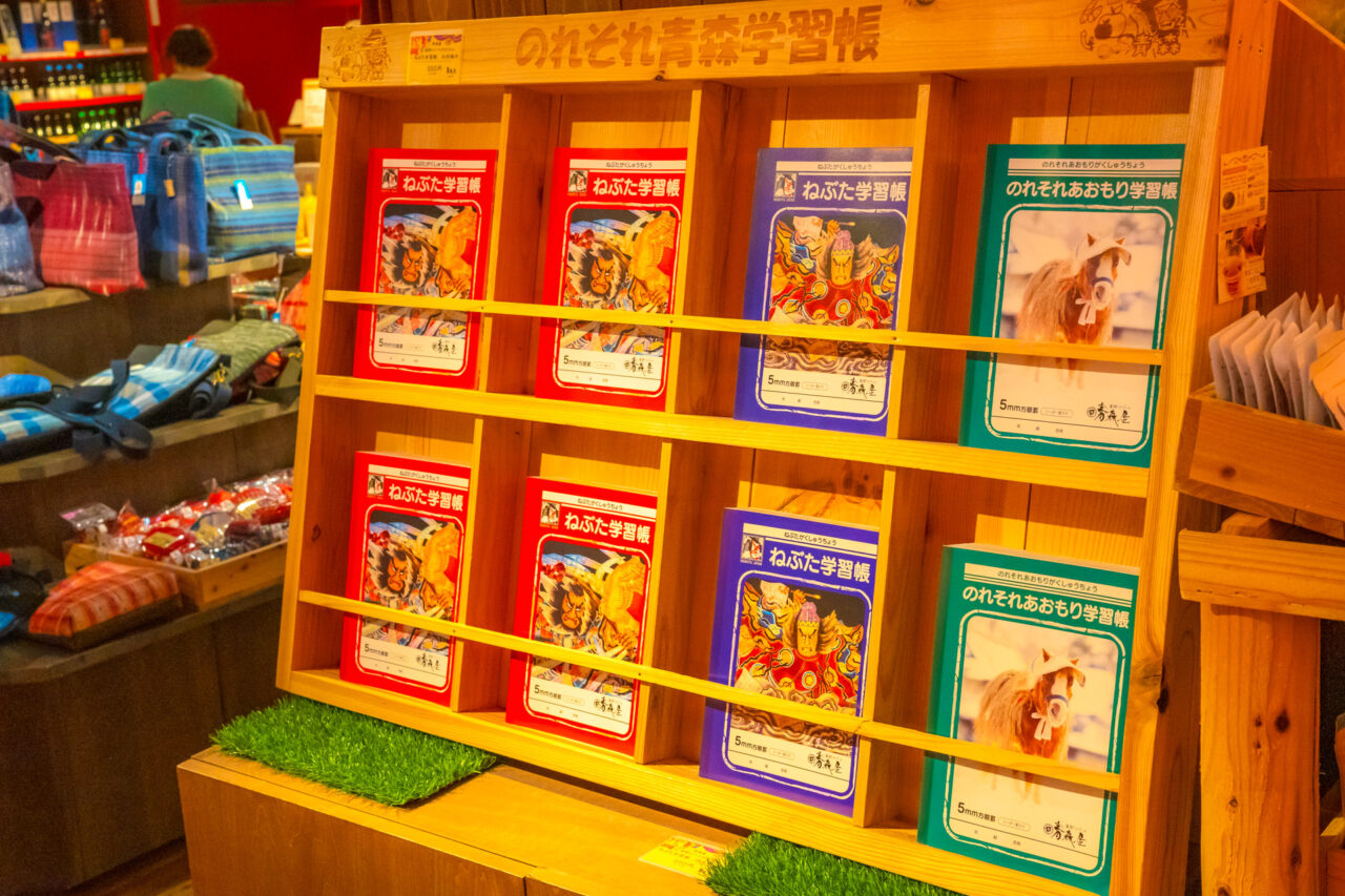青森屋オリジナルの学習帳や、浮湯の温泉水とリンゴエキスを使ったスキンケア用品、もちろんオリジナルのお菓子や雑貨や文房具や入浴剤などなど、たくさんの面白いお土産がズラリとならびます。