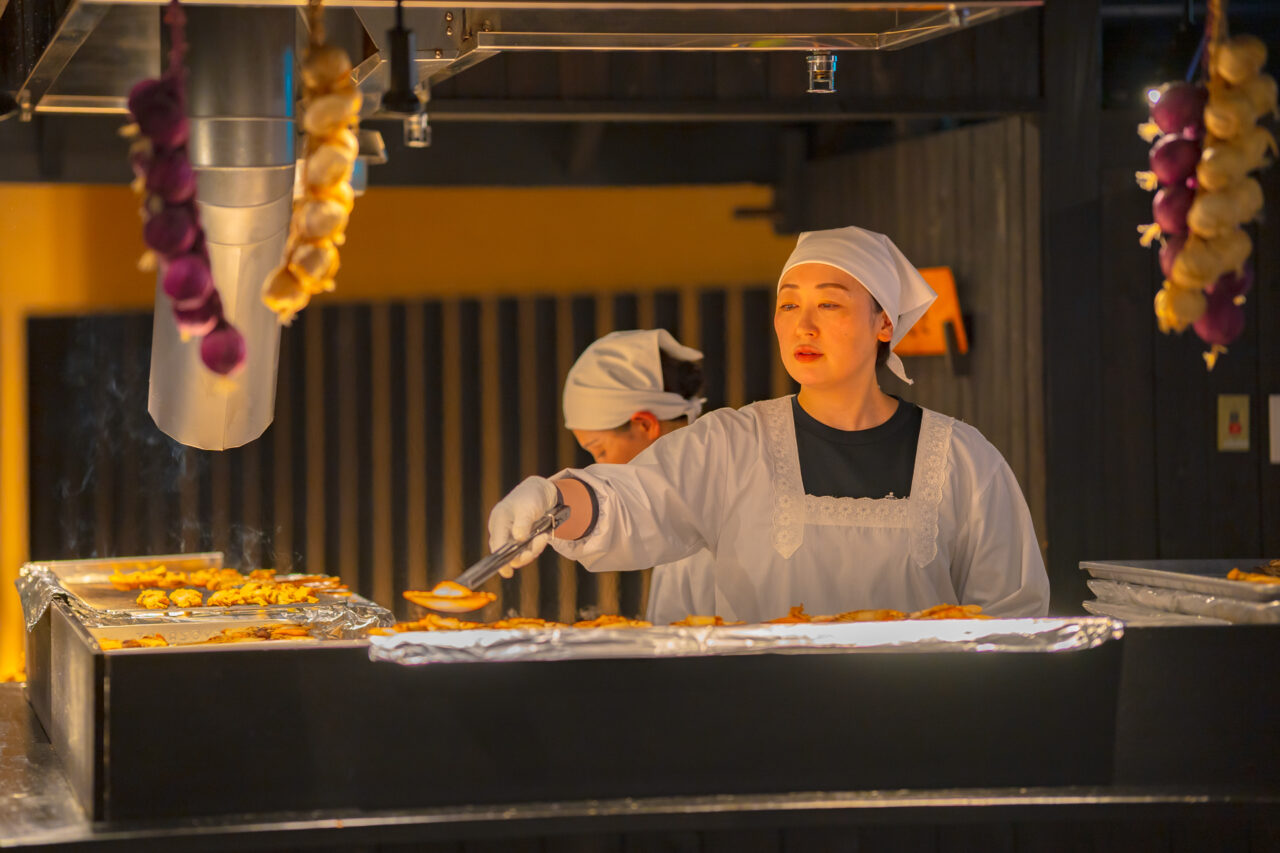 割烹着姿のスタッフさんが炉端焼きを提供してくれるので、青森の昔ながらの食卓の雰囲気を体験することができます。