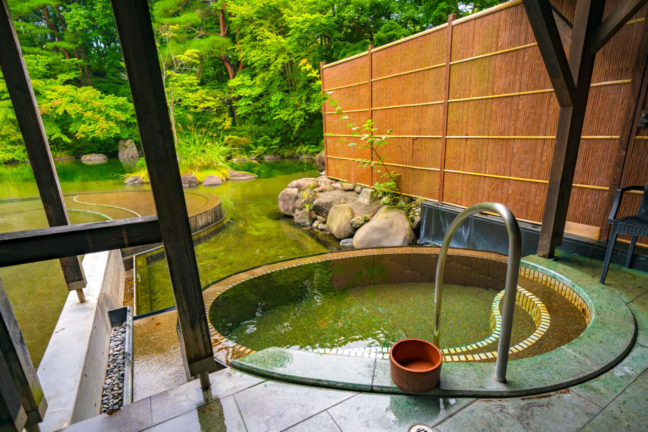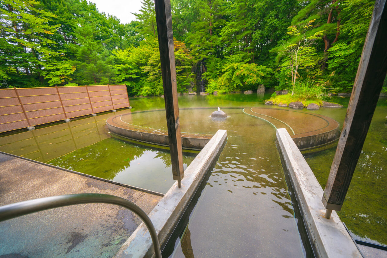 源泉かけ流し、アルカリ性のとろみのある湯につかって池と木々を眺める時間は至福。