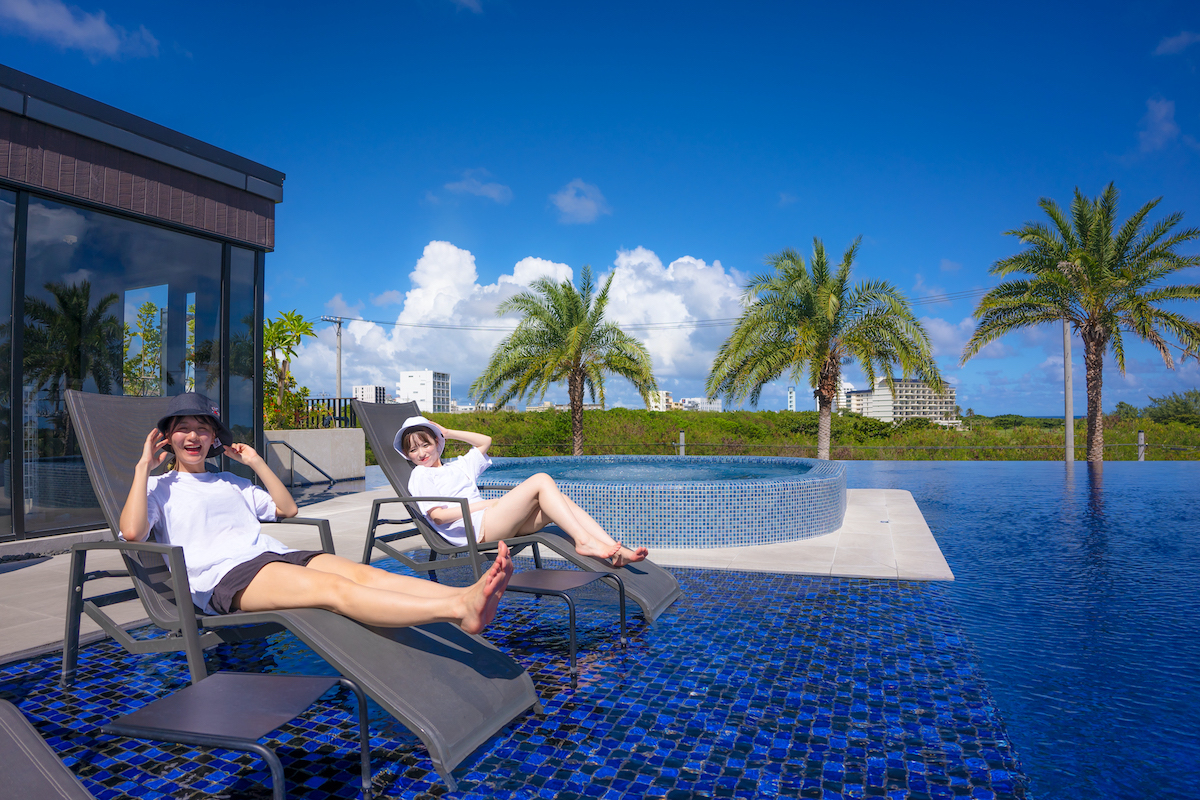 プールサイドのソファベッドスペースでくつろいだり、ジャグジーに入ったり泳いだり。