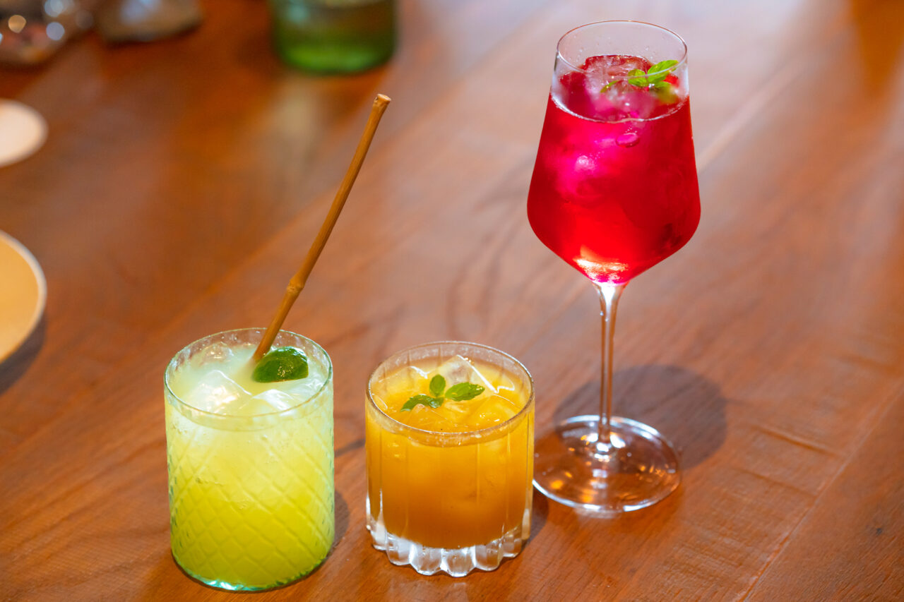 バティーダシークァーサーサワー、薪焼きマンゴーのハイボール、ドラゴンフルーツとスパイスオレンジのスプモーニ