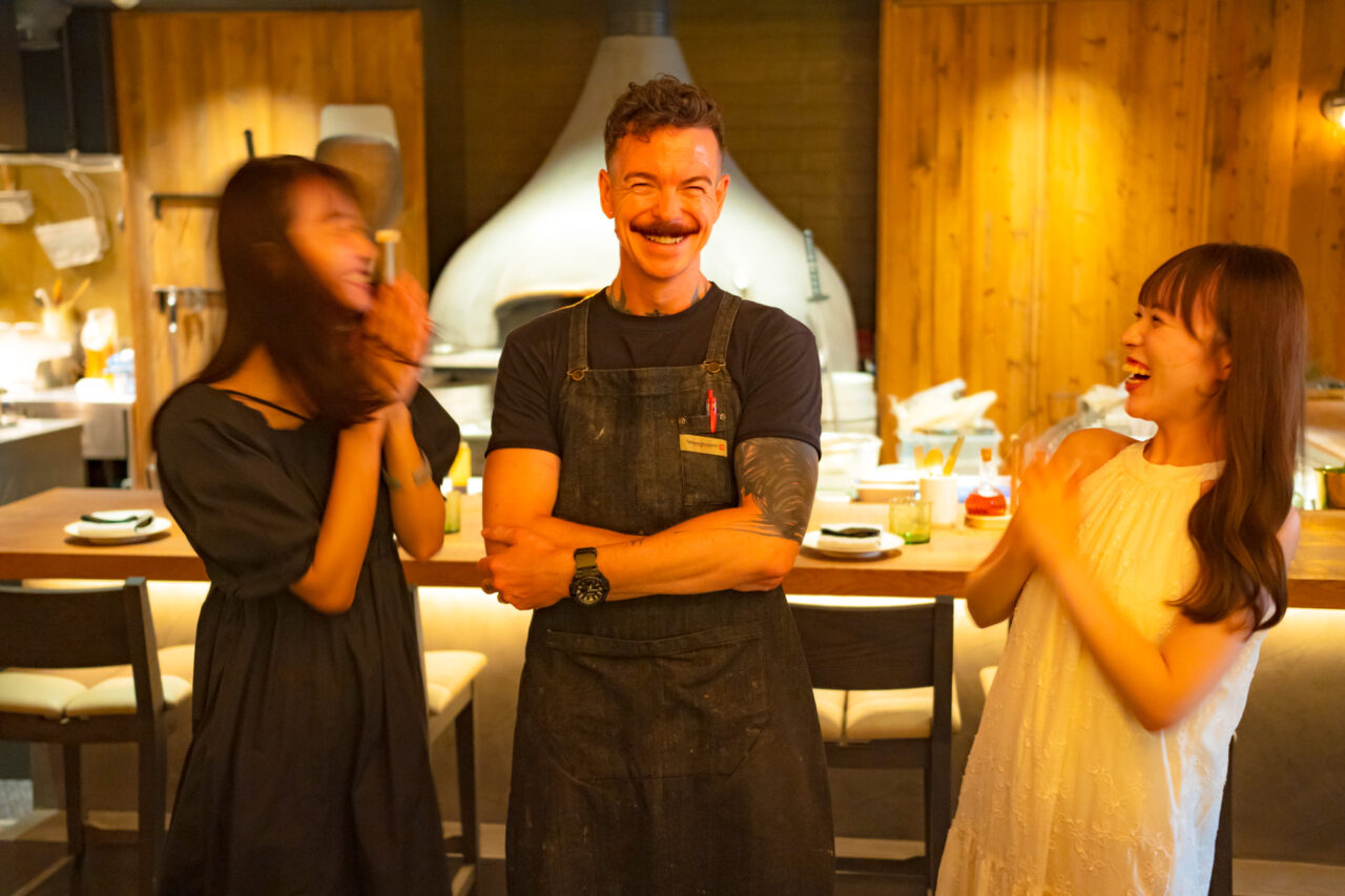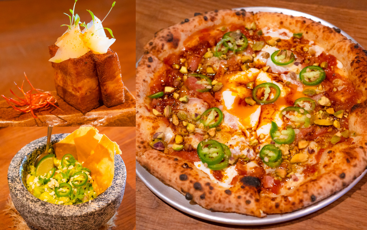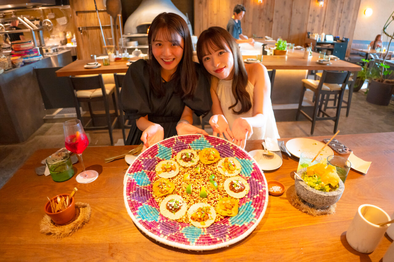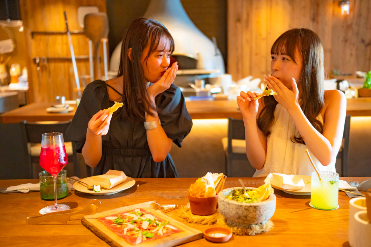 シラッチャーソースを使ったエビパン、オリジナルのワカモレ、ナポリ直輸入の窯で焼いた、スパムやハリッサを使った石垣島風のピッツァ・バティーダなど、数々の美しい料理が運ばれてきます。初めて食べるカラフルな創作ラテン料理は見てるだけで楽しいですし、青パパイヤやマイクロパクチー、ハラペーニョや岩塩など、石垣島の素材がふんだんに使われていて、旅行気分も盛り上げてくれます。