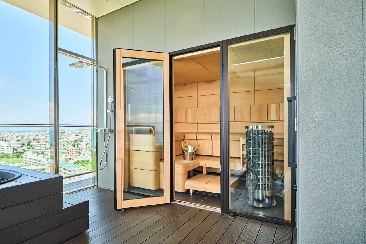 テラスにはプライベートサウナと水風呂、ジャグジーも備え付け。