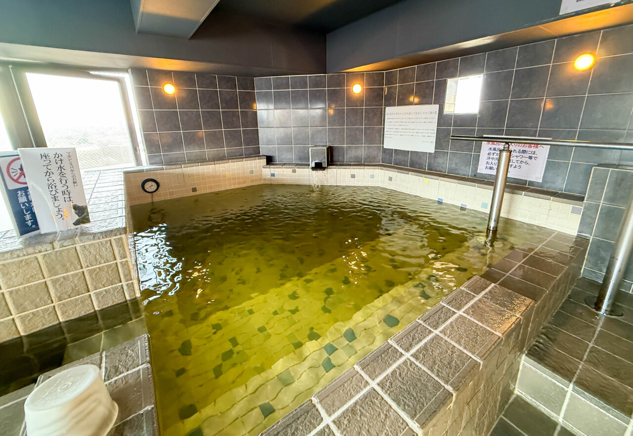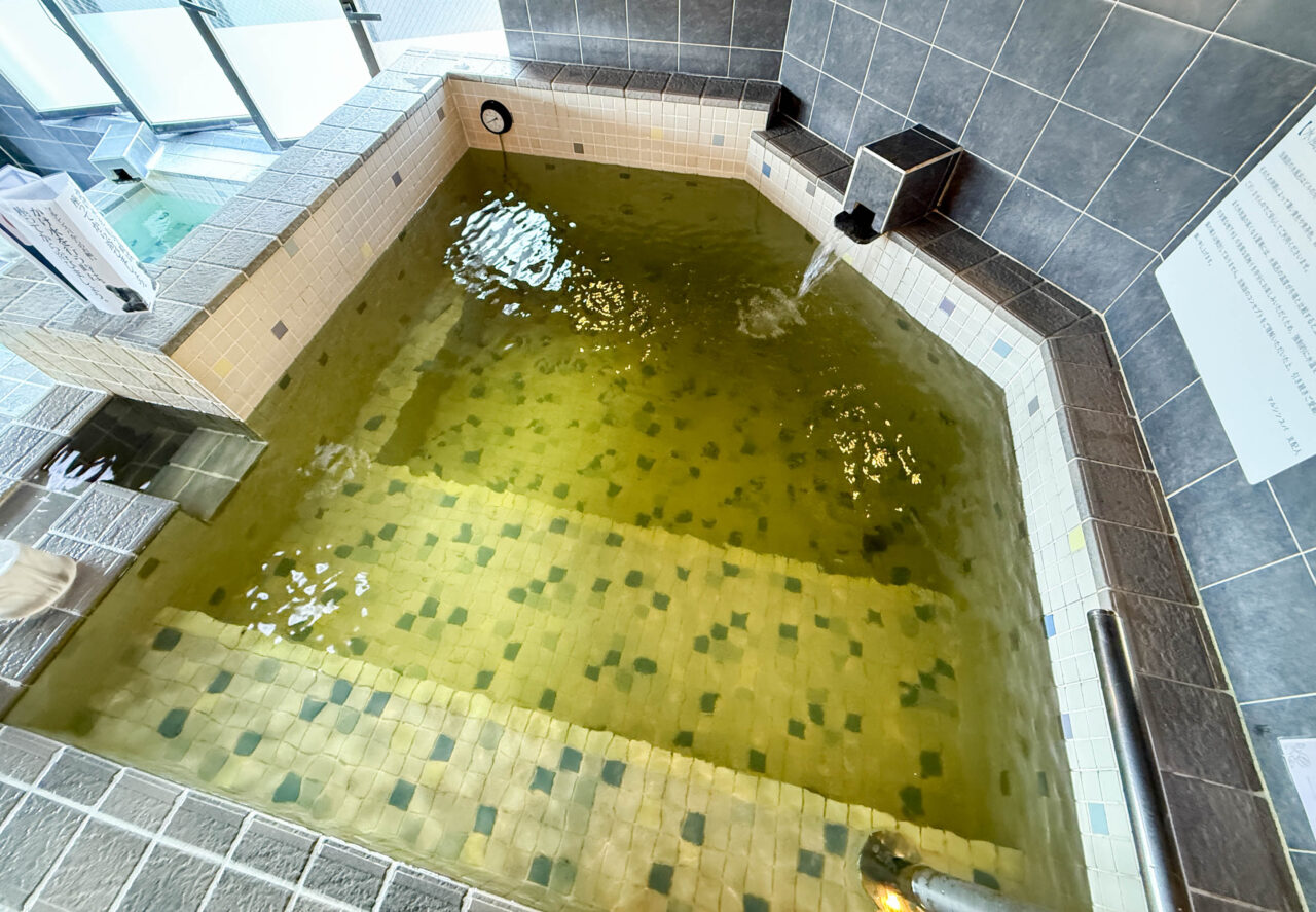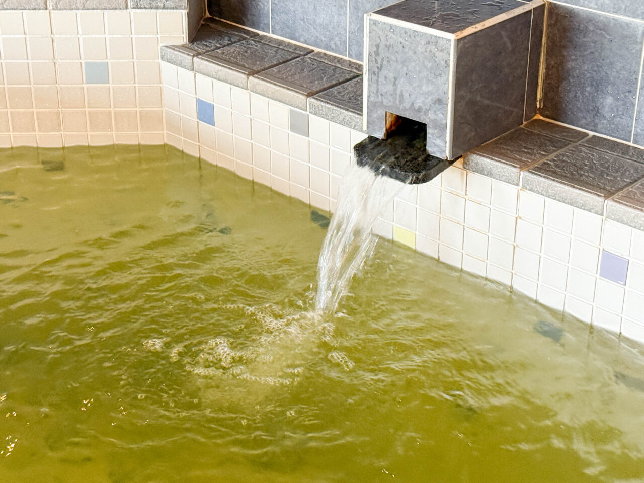 温泉成分が含まれた井戸水なので、水の色が黄色っぽい