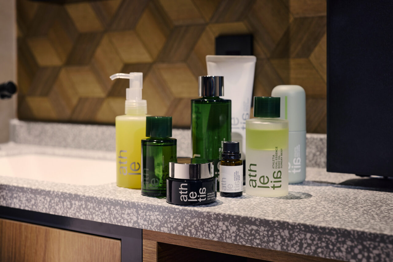 アメニティとしては、植物の力で動と静の循環に寄り添うスキンケア&ライフスタイルブランド、athletiaによるシャンプー・トリートメント、ボディソープ、スキンケアアイテムが用意されています。