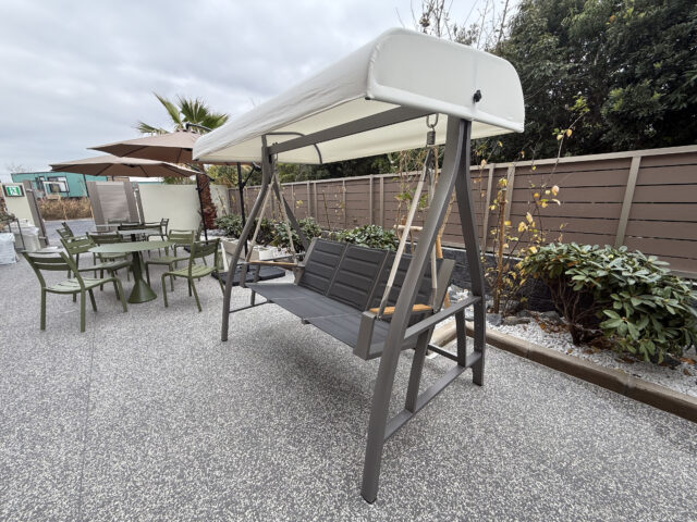 外気浴の休憩エリアには、様々な種類の椅子が!