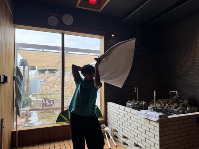 ミュージックロウリュのタイミングで、送風される激アツ熱波で痛いくらいに熱い……!全身がバチバチに温まります。