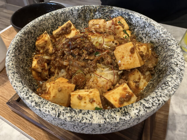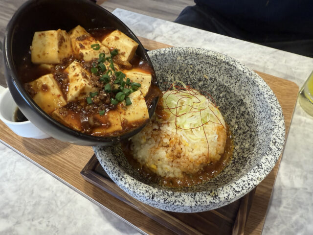 ジュゥ〜という音とともに、麻婆豆腐の香りが引き立ちます。