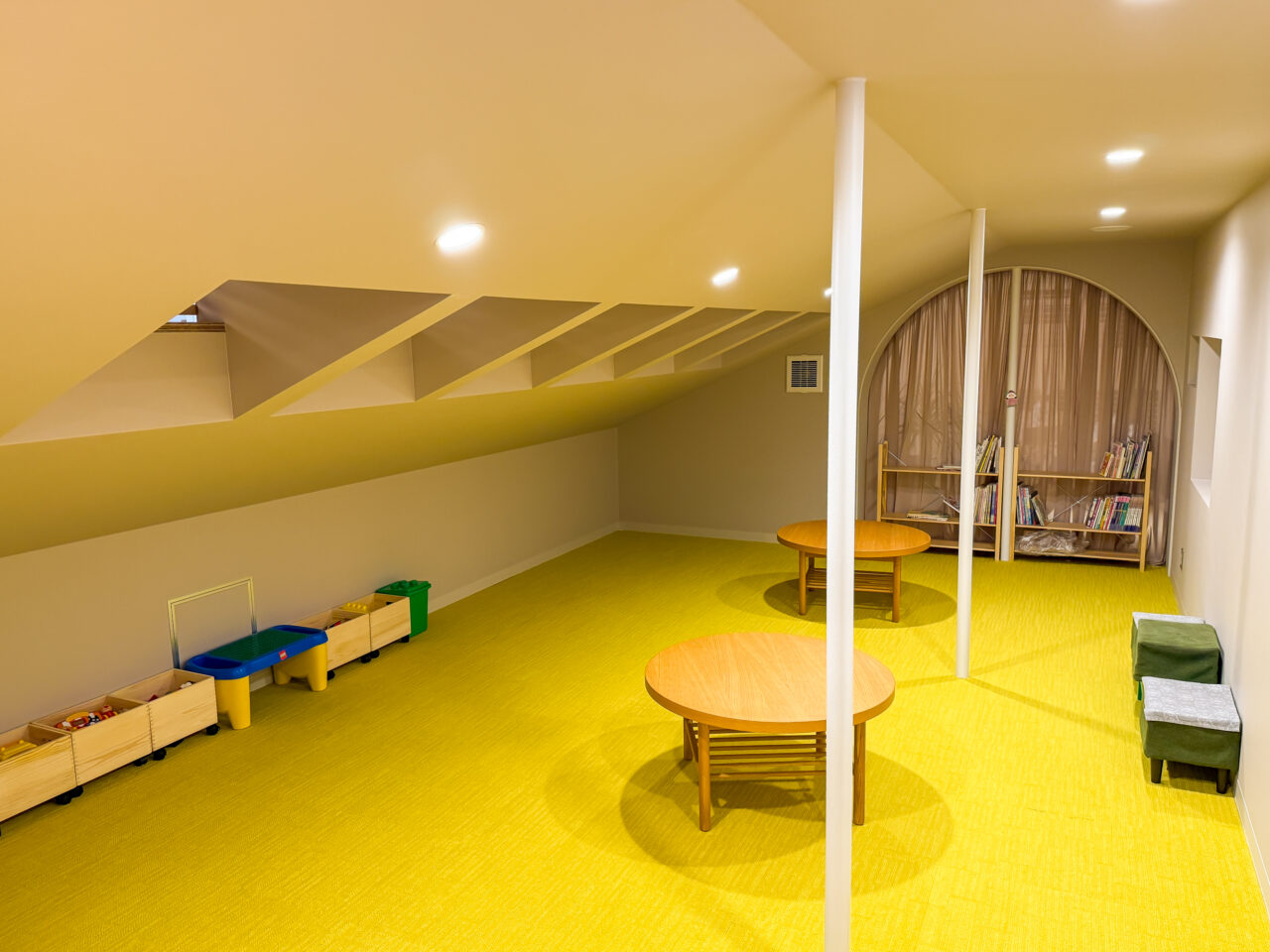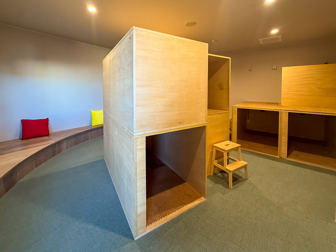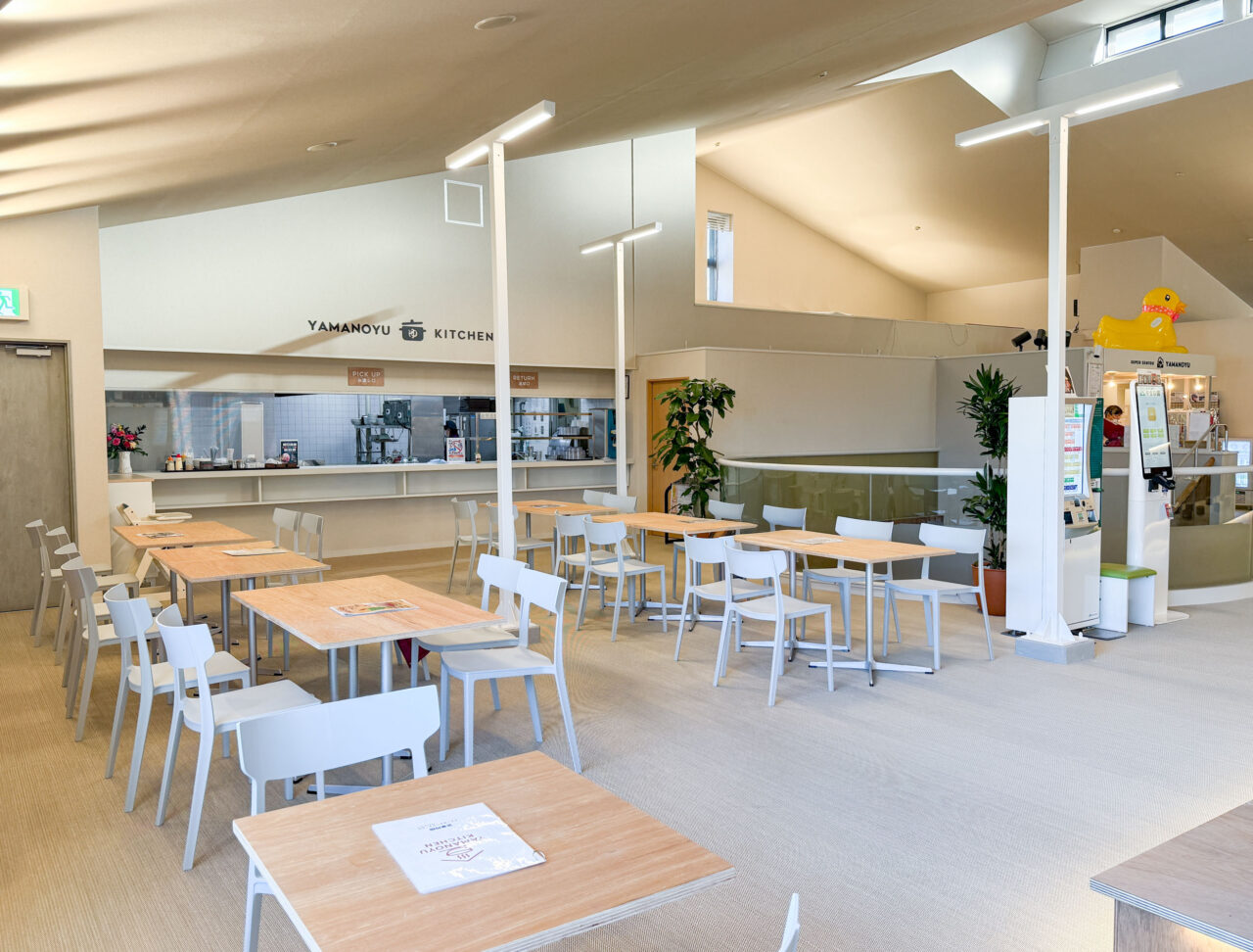 やまの湯には小さなお子様から、ご年配の方まで幅広い世代の方に利用してもらう施設です。そこで、階段下にキッズルームを設けたり、パーソナルスペースが確保されるおこもりスペースを確保したりと、世代を超えて快適に空間を共有できる場所を目指しました。
