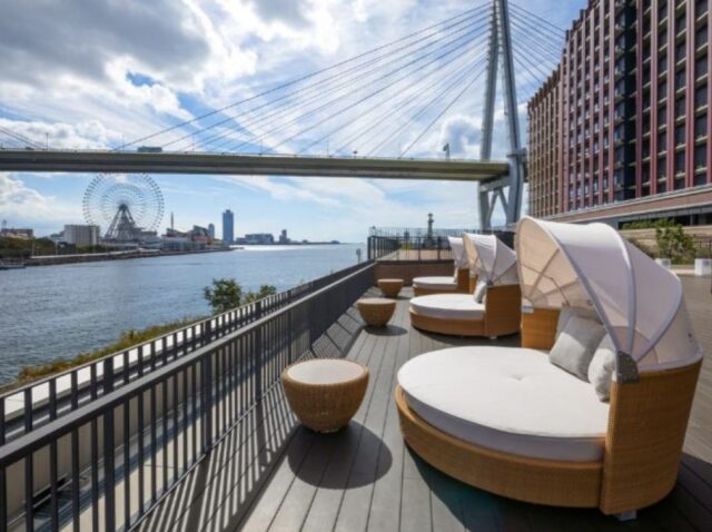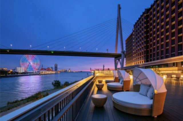 この施設の魅力のひとつがホテル外に広がるベイテラス。安治川沿いにある開放的なテラスで、ベイエリアの景色を眺めながらのんびり過ごせる空間です。昼は川沿いの風が気持ちよく、夜はライトアップされた落ち着いた雰囲気が楽しめます。