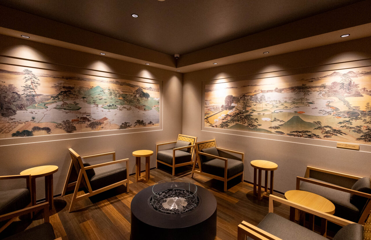 ラウンジに飾られた絵画(複製)は江戸時代に描かれた水前寺成趣園の様子。現在とほぼ同じ風景になっているそうです。