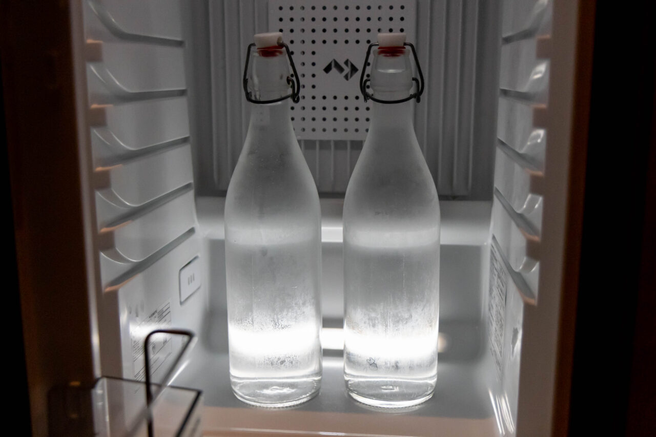 ラウンジに冷やしてある天然水100%の「くまもとの水」。